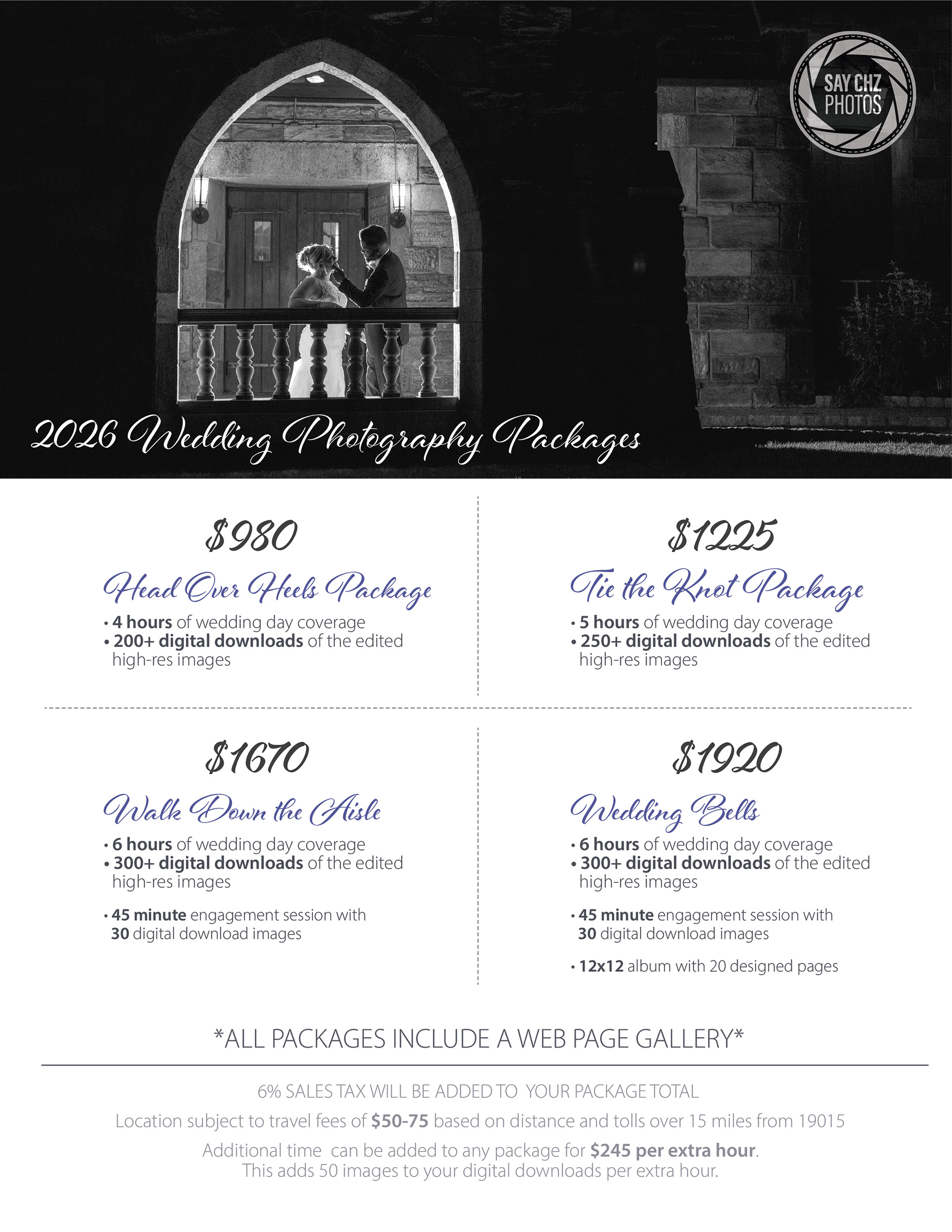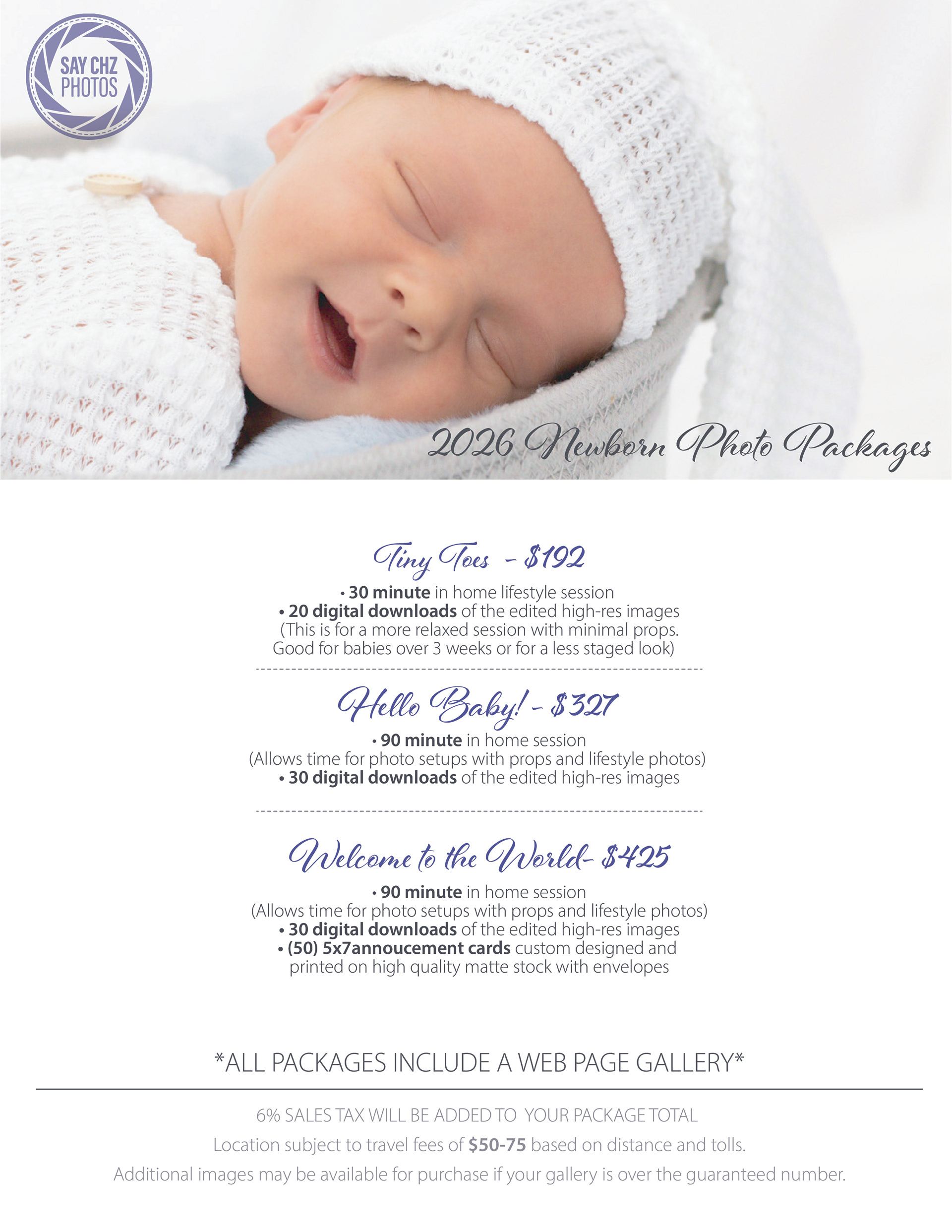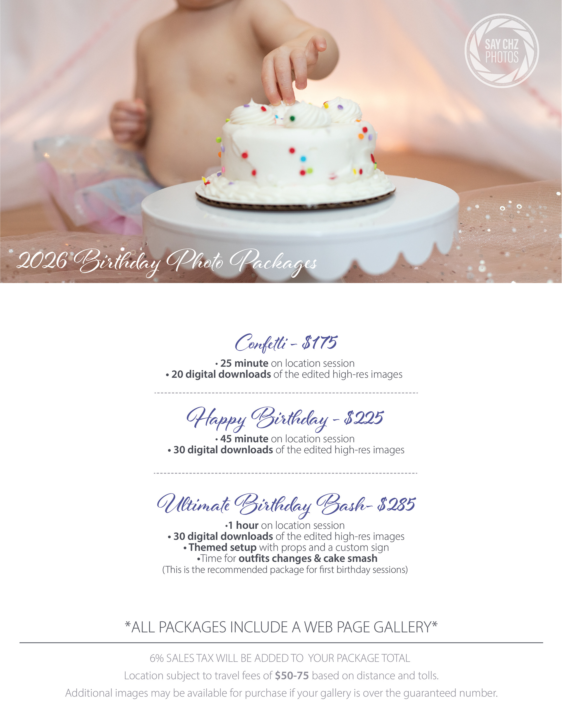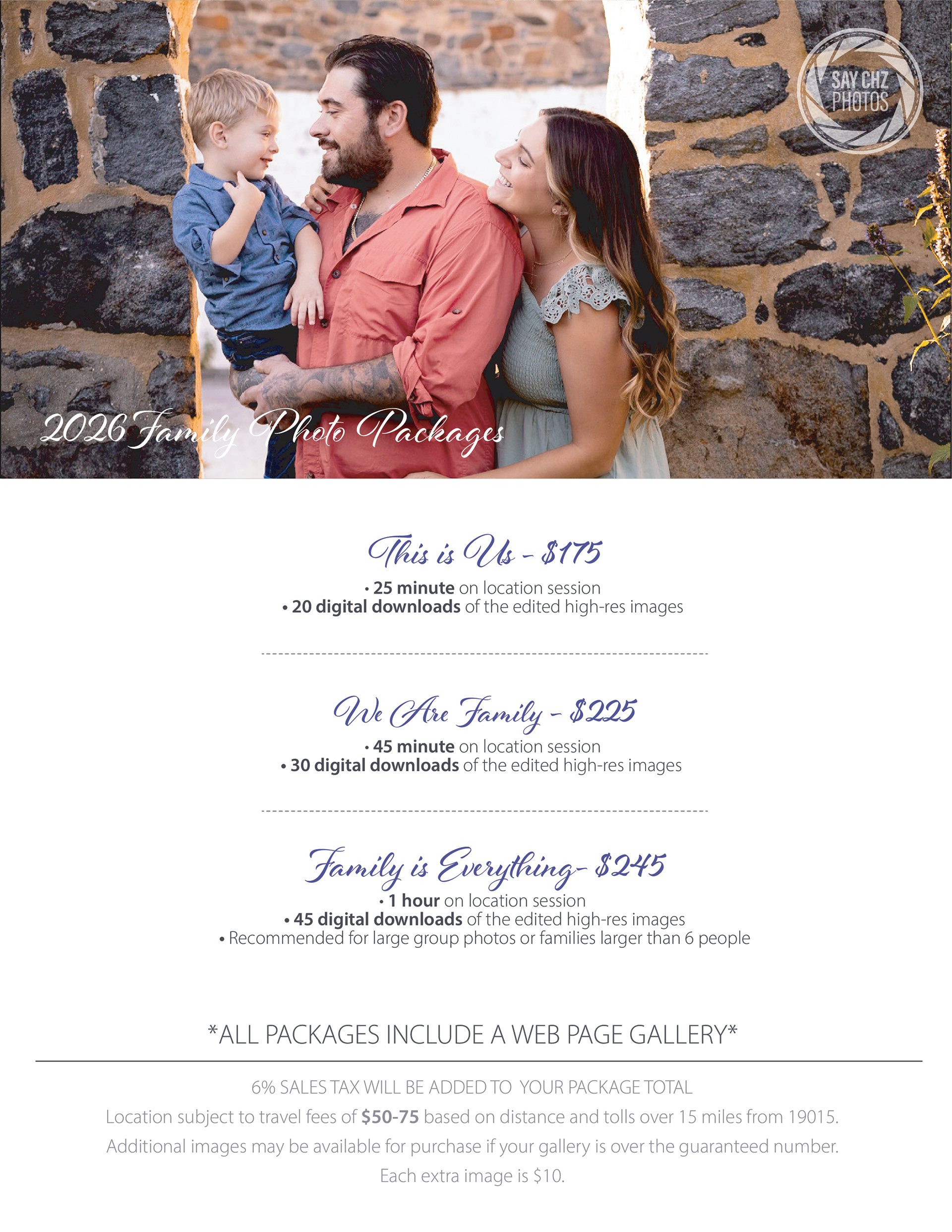 *To officially book, all sessions require a 25% retainer fee and are subject to 6% sales tax. Sessions over 20 miles will have an added travel fee based on distance and tolls.*